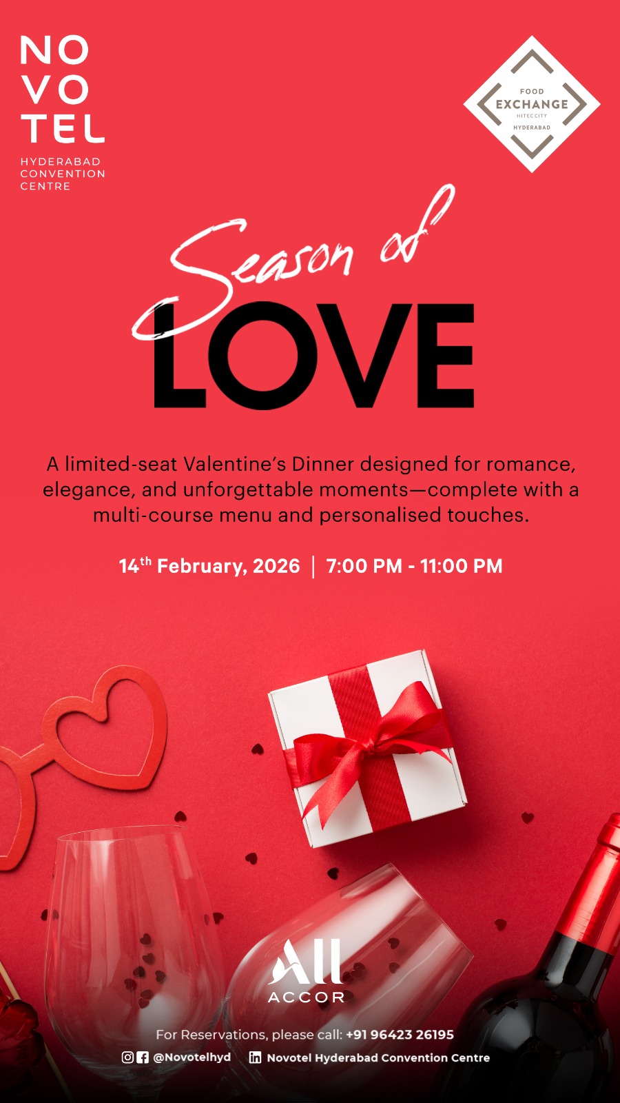 Celebrate love in an elegant and intimate setting as Food Exchange, Novotel Hyderabad Convention Centre presents a specially curated Valentine’s Day Dinner. Designed as a limited-seat, pre-booked experience, the evening promises a romantic ambience, personalised touches, and a thoughtfully crafted multi-course menu to make your celebration truly memorable.