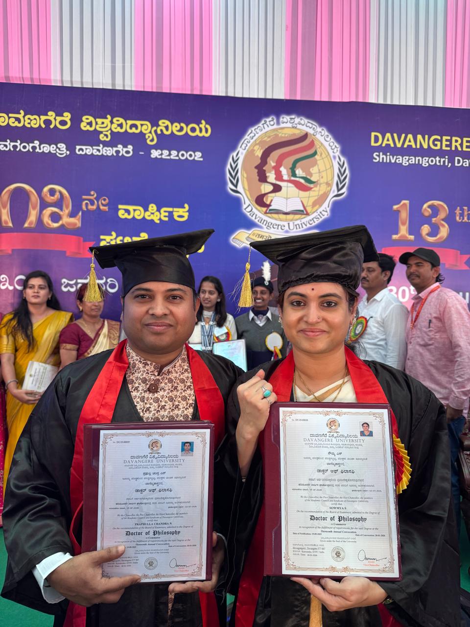 Davangere University continues to play a significant role in promoting advanced research and academic innovation. The successful completion of doctoral research by scholars like Dr. Praphulla Chandra N and Dr. Sowmya S underscores the university’s commitment to fostering high-quality research, interdisciplinary studies, and industry-relevant scholarship.