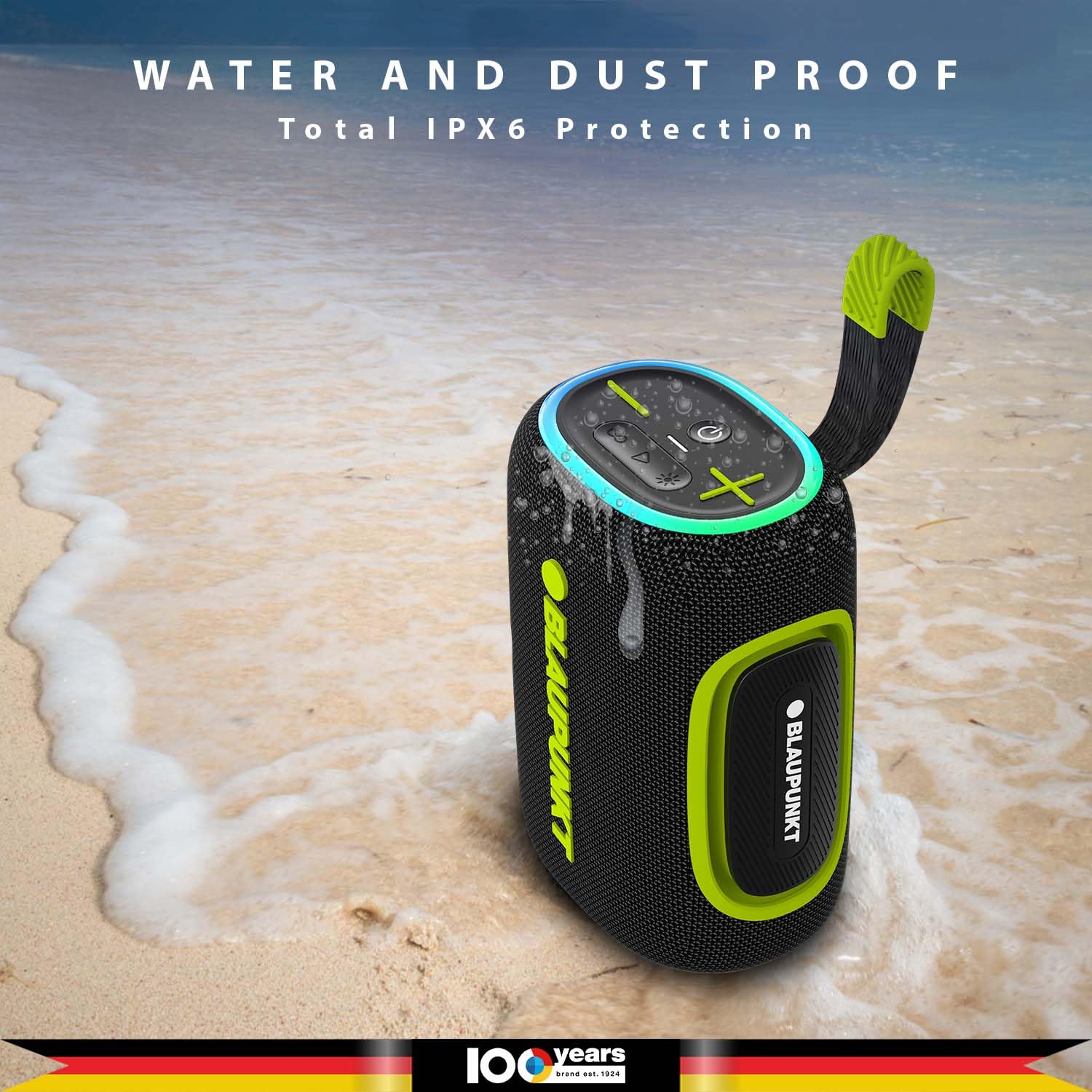 Built for Any Conditions True to Blaupunkt’s reputation for robust build quality, the OMG Atom features an IPX6 rating, providing reliable protection against splashes and dust. Whether used indoors or outdoors, the speaker is engineered to perform consistently across a wide range of conditions. Innovative Design with Party Aura Lights Breaking away from conventional cylindrical designs, the Atom boasts a compact, edgeless, and rugged form factor, complemented by an intuitive control panel for effortless use. Adding to its appeal are dual Party Aura Light rings that sync with the music, creating a vibrant and immersive ambience.